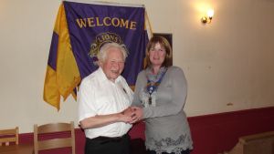 ON HIS RETURN FROM EIRE, WHERE HE PAID A VISIT TO THE DUNGARVAN LIONS CLUB IN COUNTY WATERFORD, IT WAS TIME FOR REG NORTON TO HAND OVER THE PRESIDENCY TO LION ALISON SALES. THE CEREMONY TOOK PLACE AT OUR REGULAR MONTHLY MEETING IN JULY. CLUB MEMBERS WERE JOINED BY TWO PROSPECTIVE LIONS, VIVIENNE PUGH AND DR. IAN CHRISTIE FOR THE INDUCTION OF THE NEW LION PRESIDENT.
